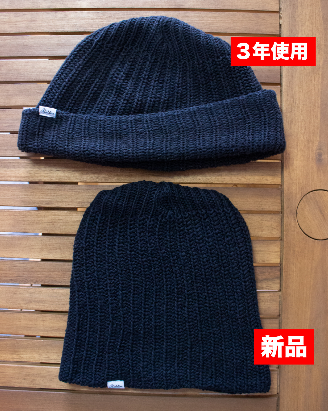 せっかくなので、新品と僕が3年間使い込んだビーニーと比較してみました。