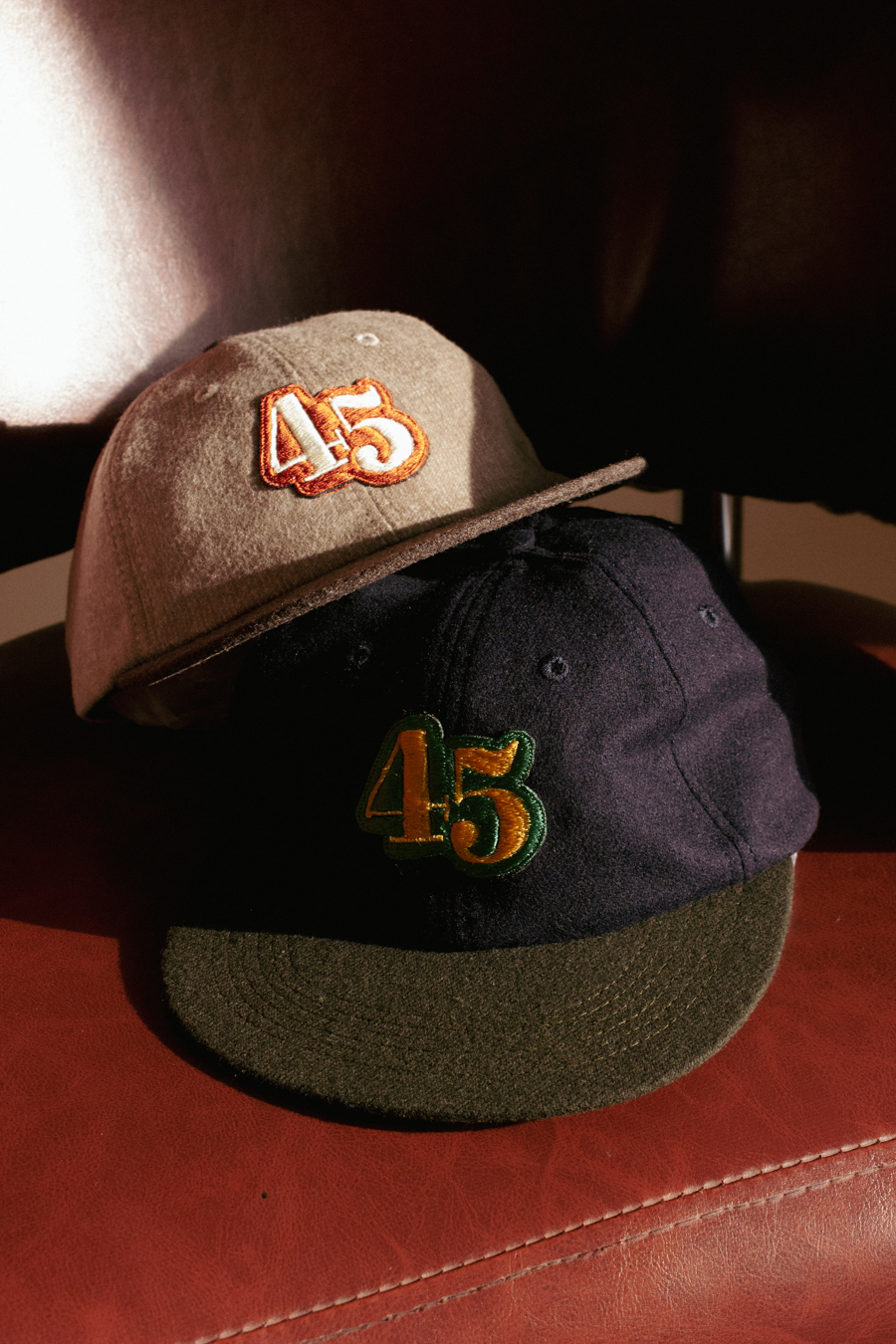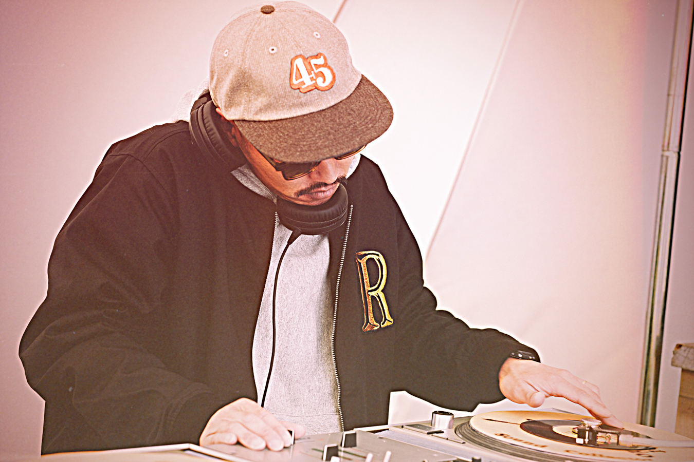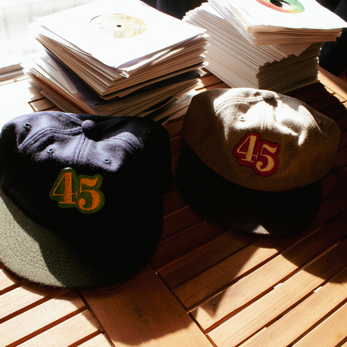 7インチレコードの回転数45rpmにちなんだ数字を贅沢に横振り刺繍で描いていただきました。