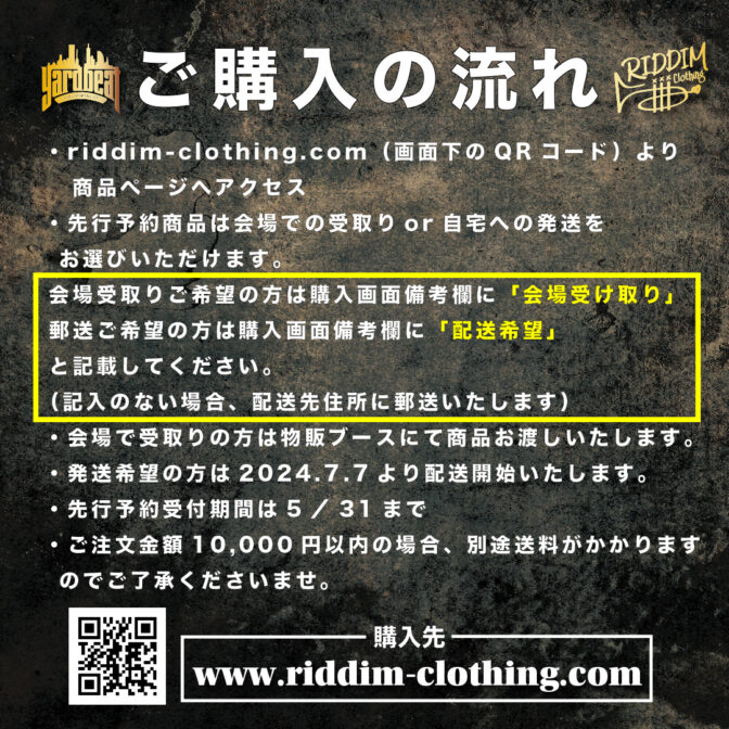 商品お届け(イベント会場にて受取り希望の方):REGGAE CAMPイベント会場にて物販スタッフにお声掛けください。